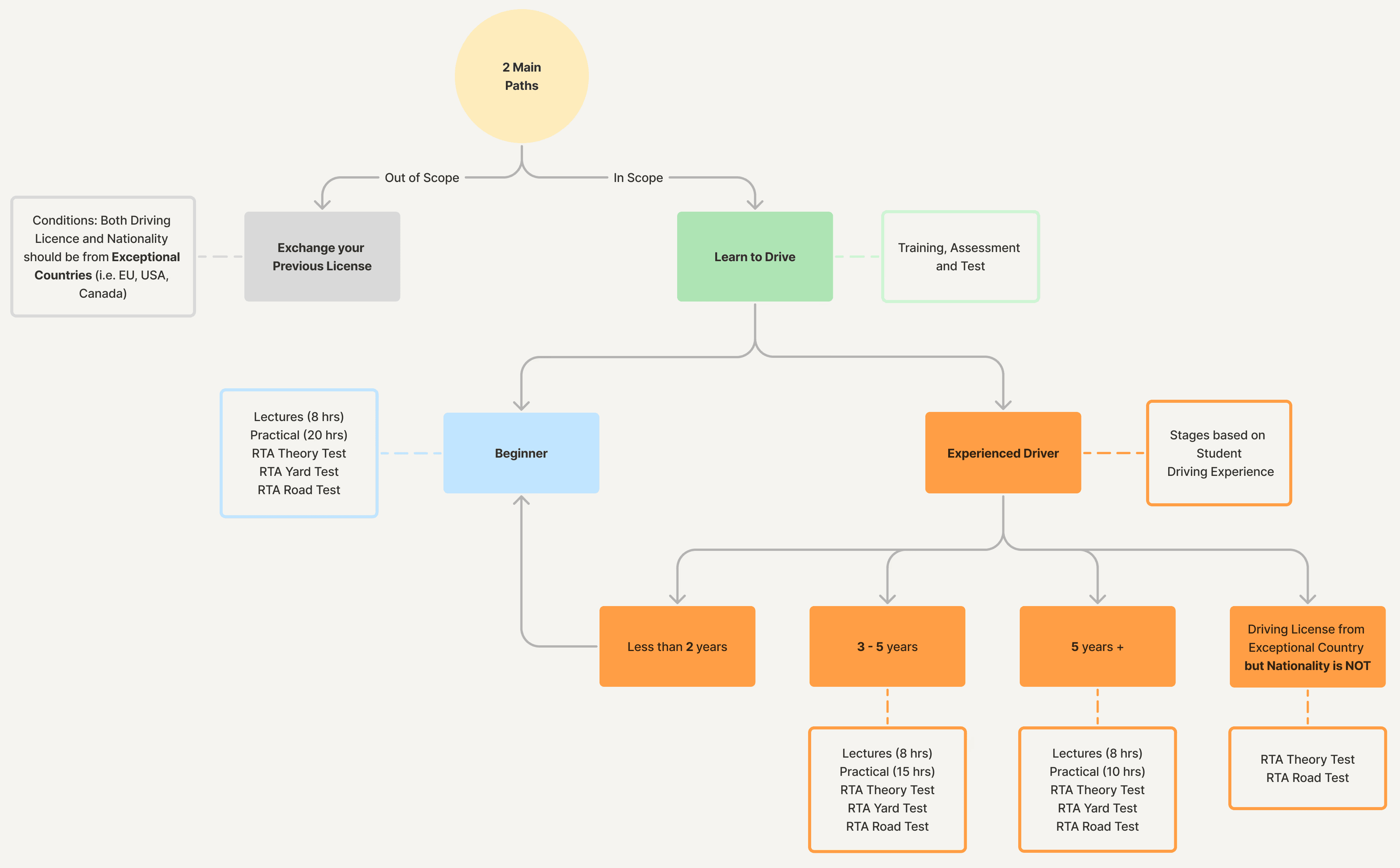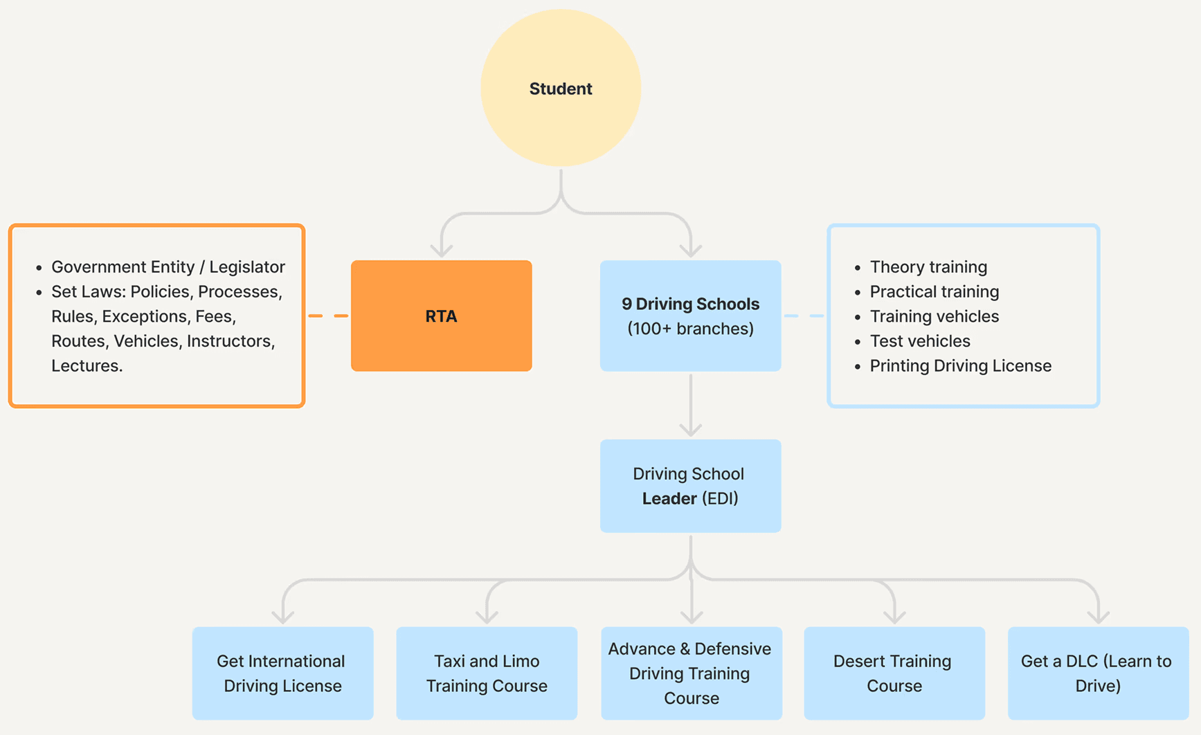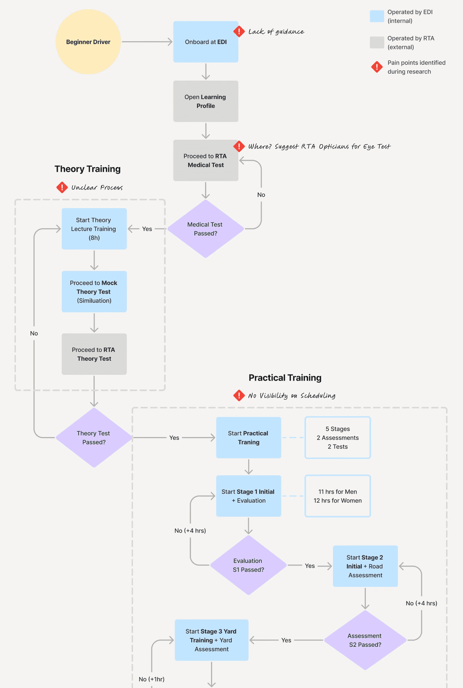 Mapping stakeholders from RTA regulators to driving school operators. I clarified the constraints, de pendencies, and approval points influencing the user experience.