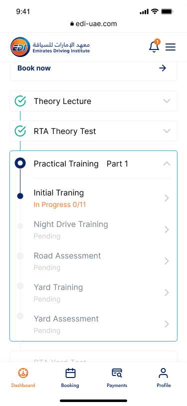 Practical training is broken down into clear stages (initial, night, road, yard), each with visible progress and assessment checkpoints. This helps students understand where they stand and what’s required to move forward.