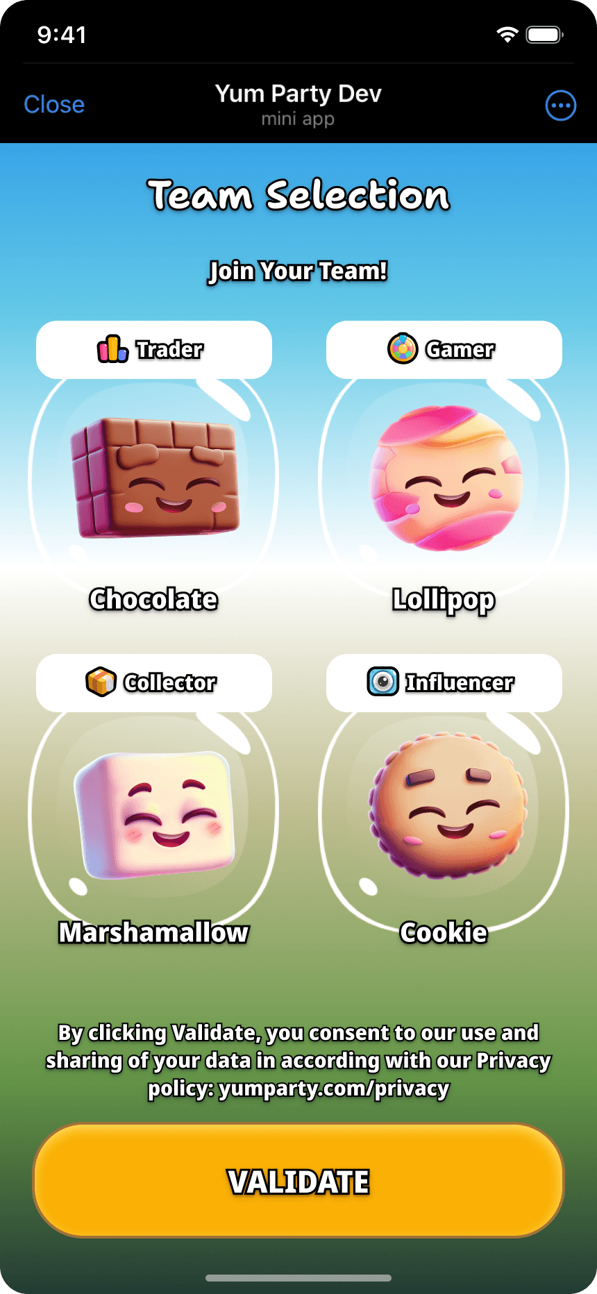 First onboarding screen where players choose a team aligned with their playstyle (Trader, Gamer, Collector, Influencer). Each candy character visually represents a strategy archetype, helping users instantly identify themselves and decide quickly. Large illustrations guide attention while a single CTA keeps the action clear and focused.