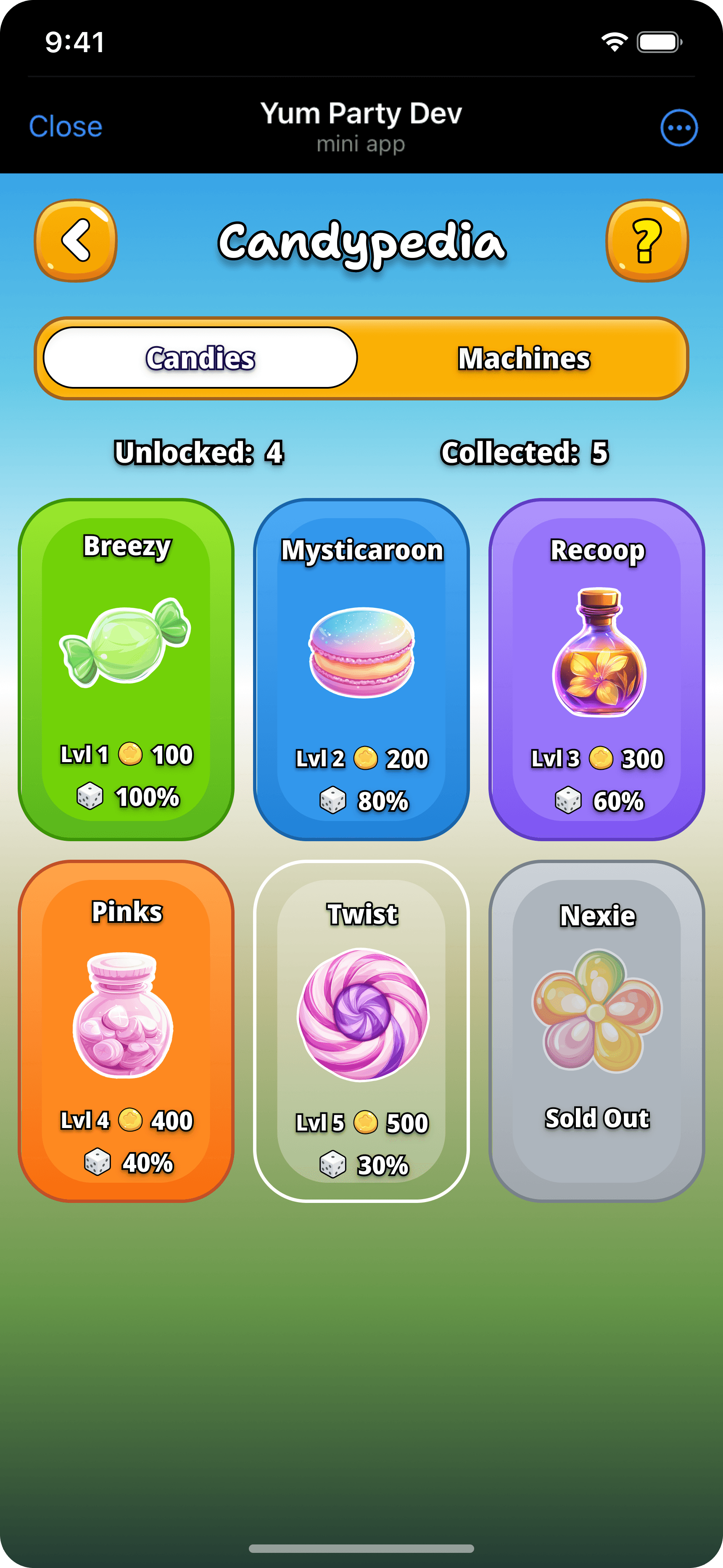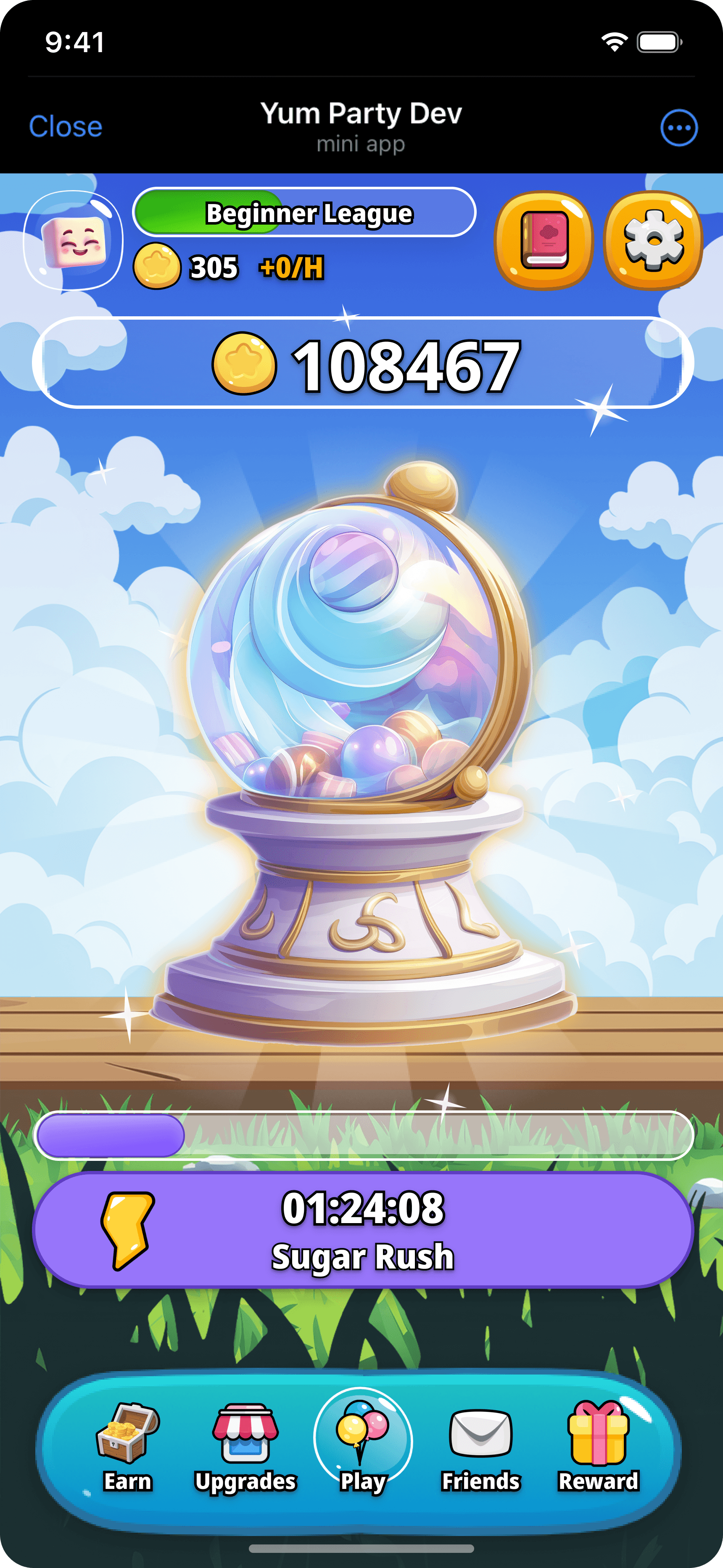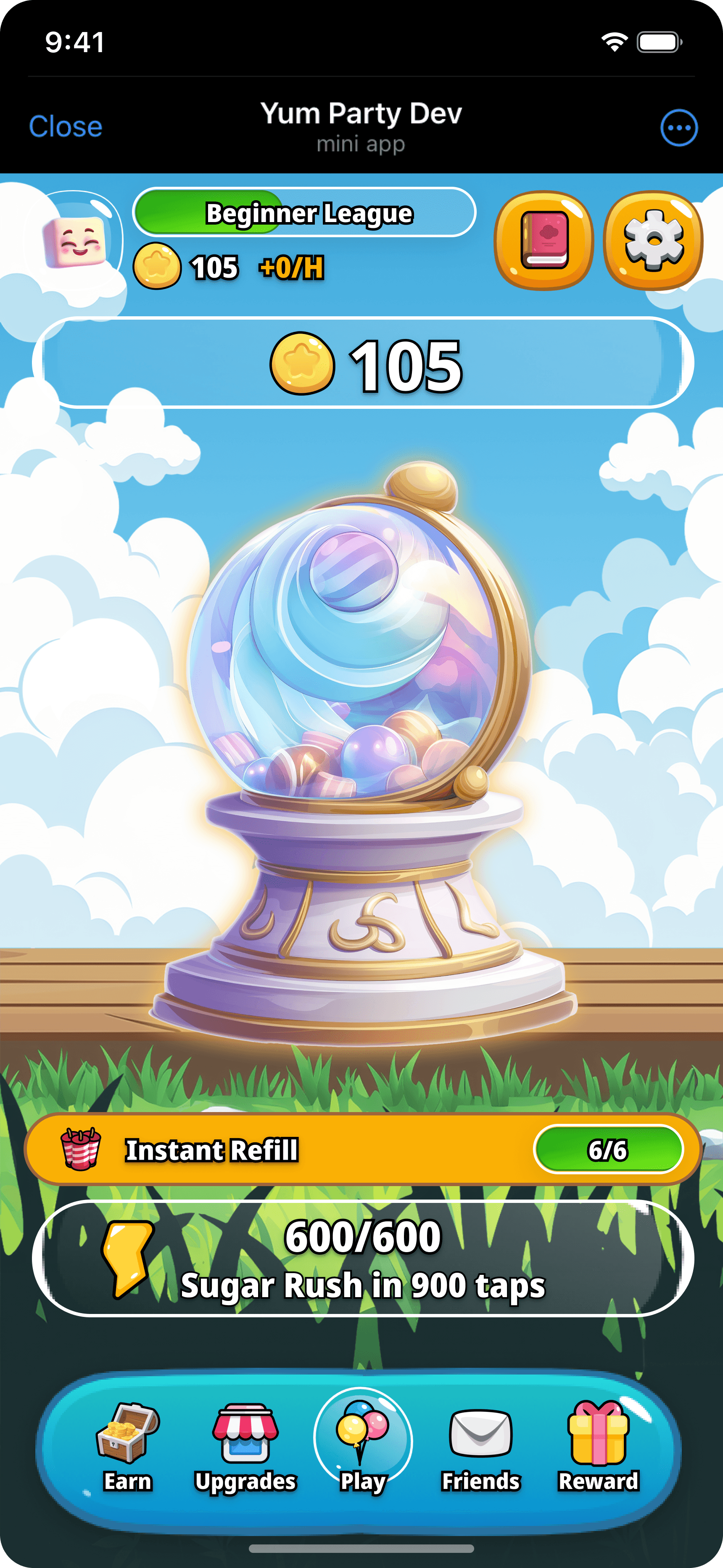 Yum Party is a tap-to-earn game designed for the Telegram mini-app ecosystem. Players generate coins by tapping, completing challenges, and upgrading candies and machines that increase their production over time.
