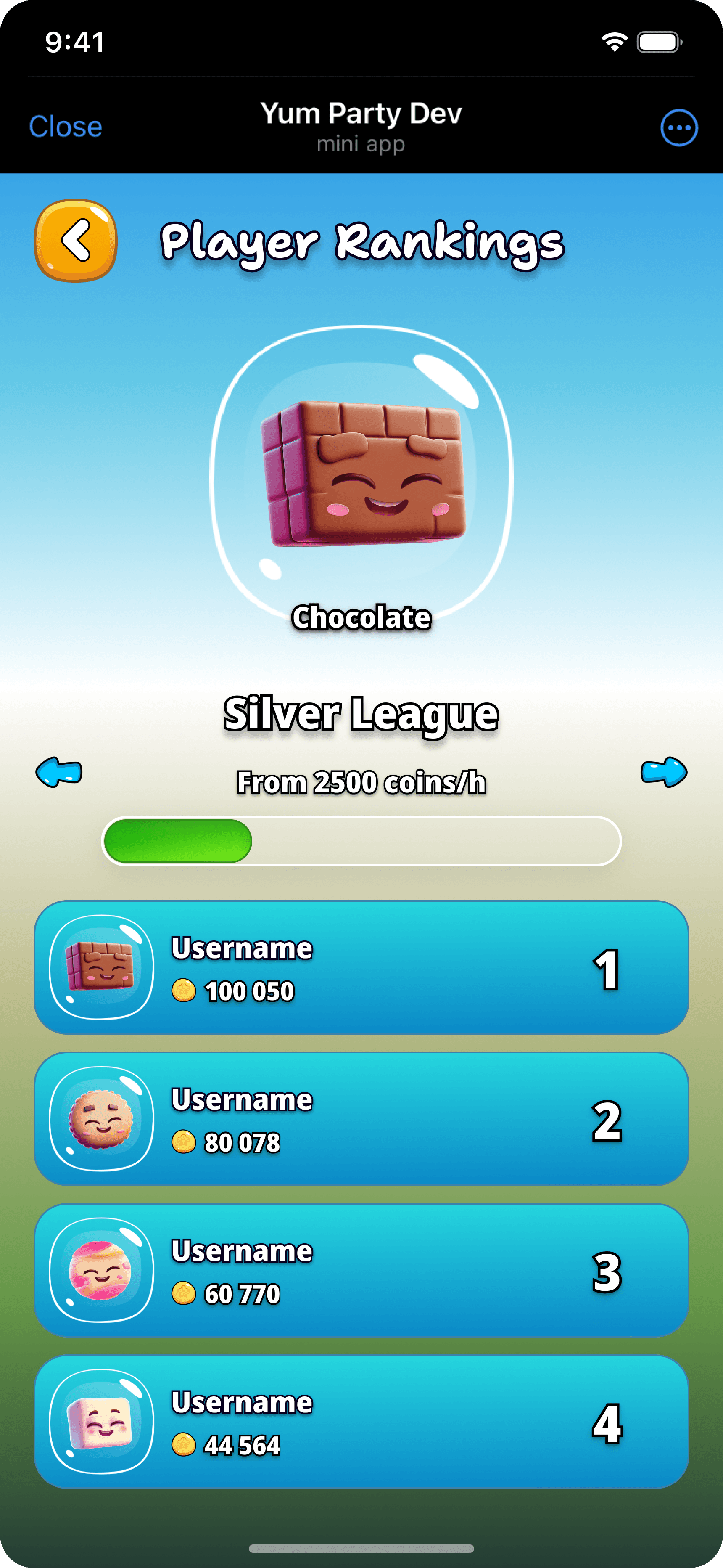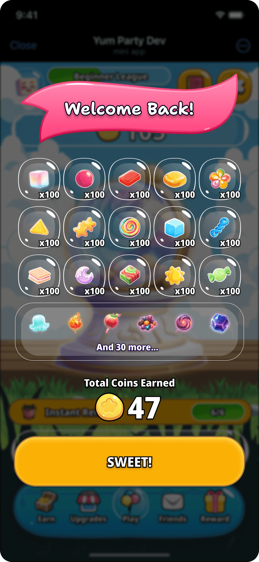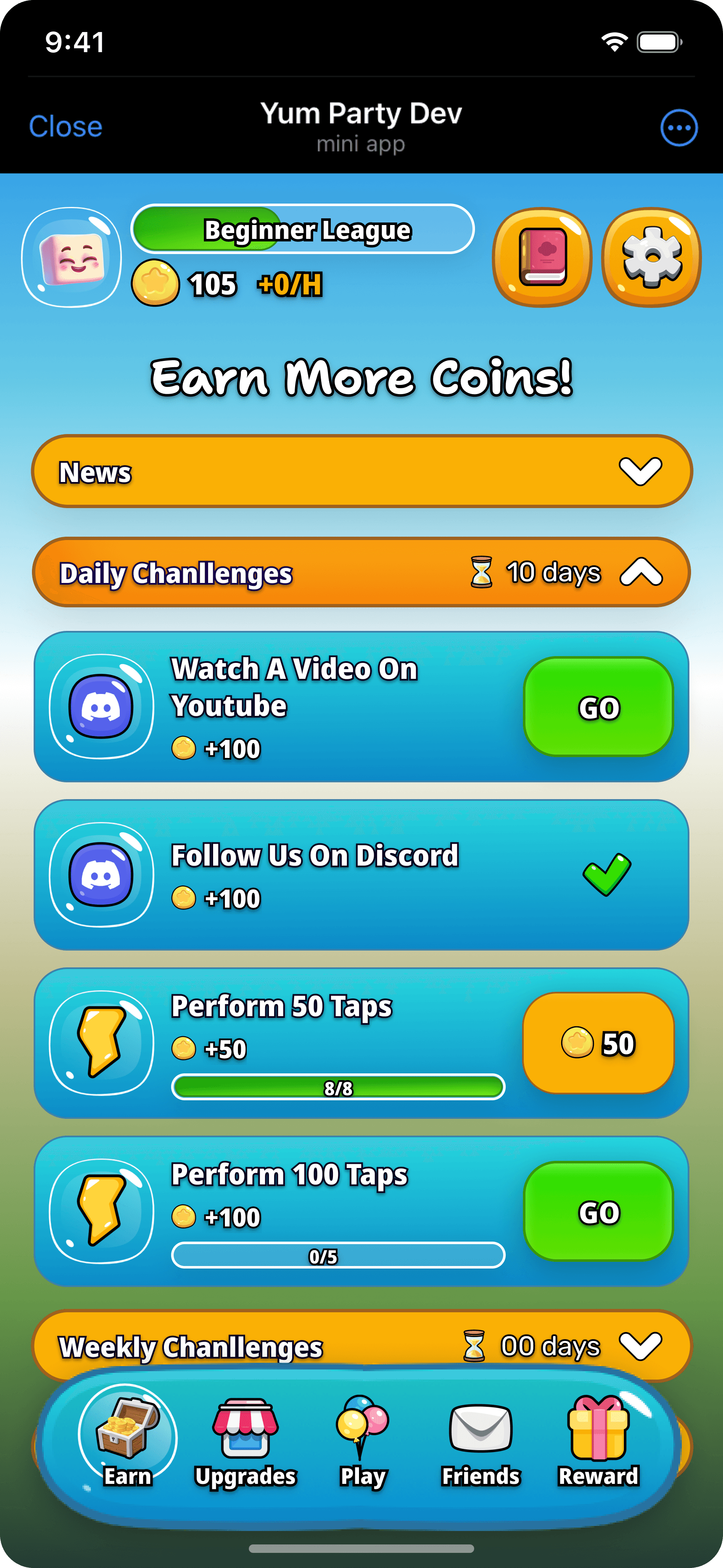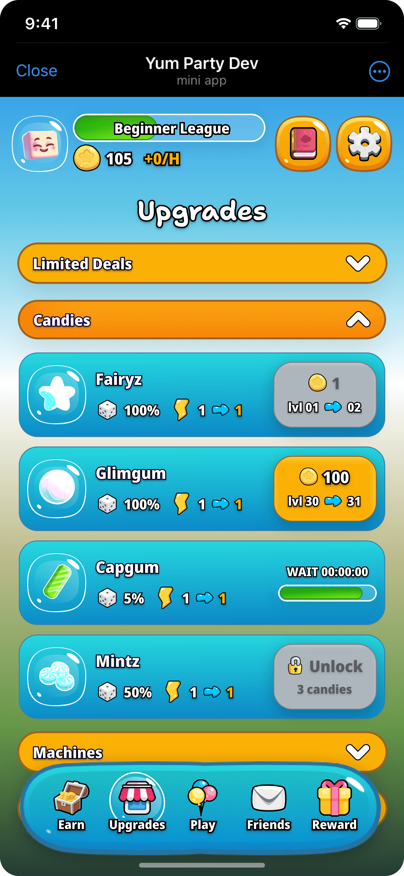 Yum Party is a tap-to-earn game designed for the Telegram mini-app ecosystem. Players generate coins by tapping, completing challenges, and upgrading candies and machines that increase their production over time.