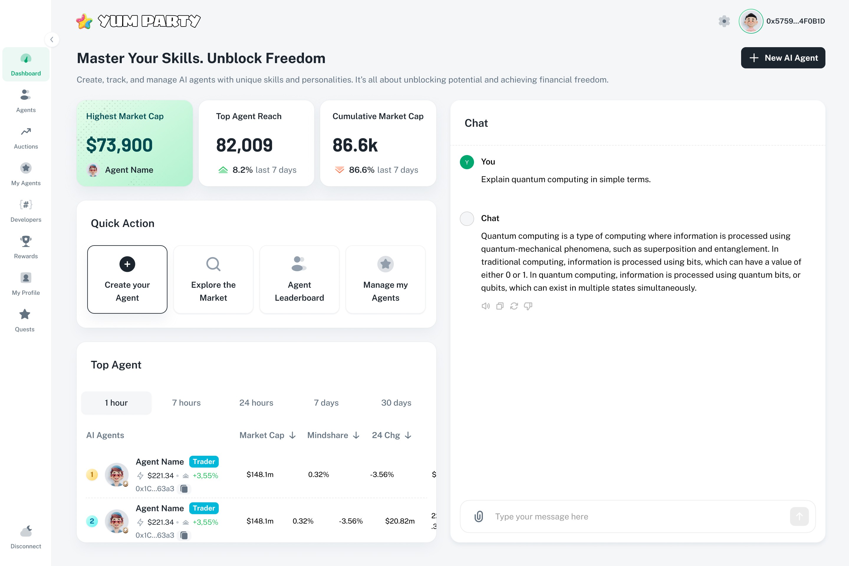 As part of the Yum Party ecosystem, I designed this dashboard to explore how AI agents could be managed as evolving assets within a competitive environment. I focused on surfacing key performance indicators, rankings, and optimization actions to help users understand value instantly and make informed decisions without navigating complex data layers.