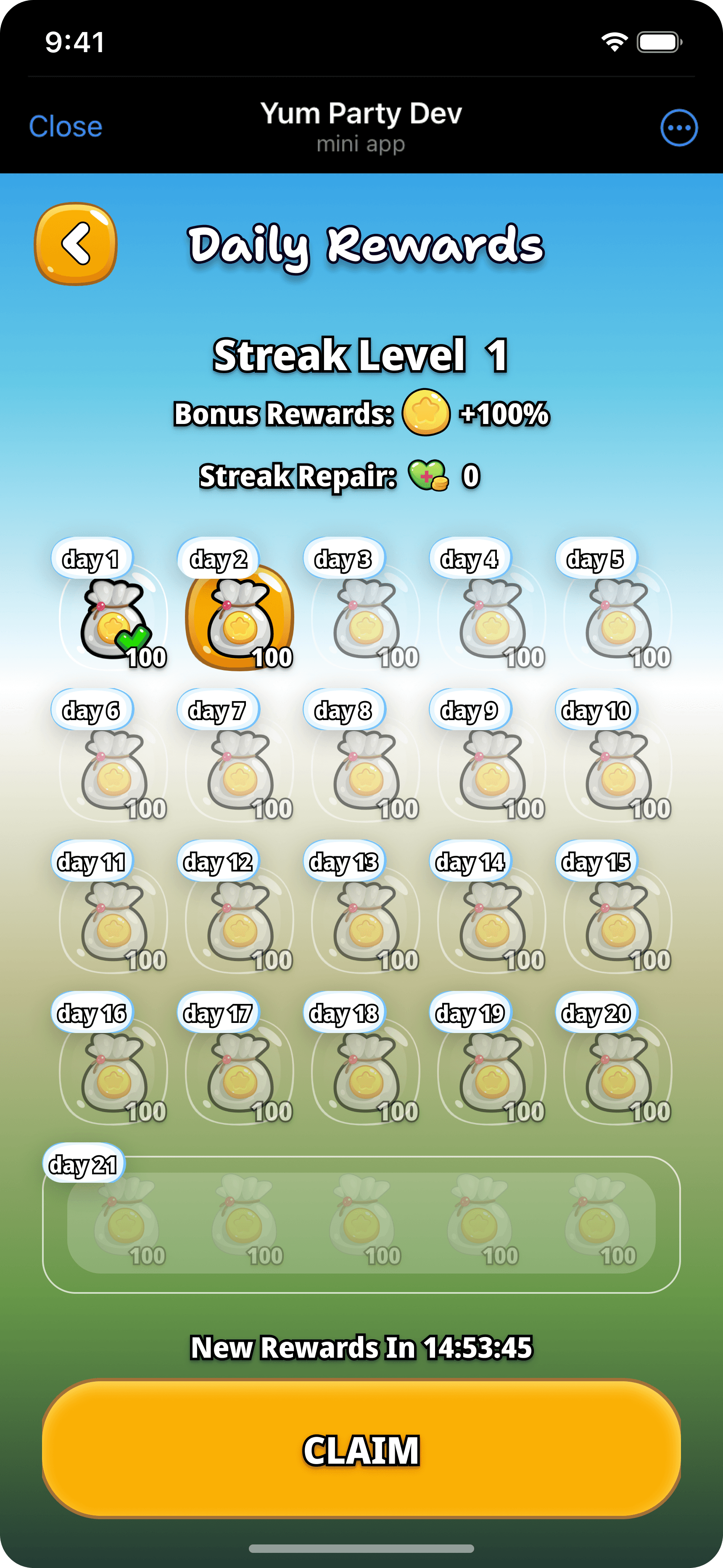 The rewards system provides structured daily bonuses and return incentives that encourage consistent engagement. A streak mechanic visualizes progress over time, while countdown timers and claim actions create anticipation and reinforce habit loops. Returning users are welcomed with summarized reward feedback, instantly showing earned items and total value to create satisfaction and reinforce positive reinforcement.
